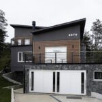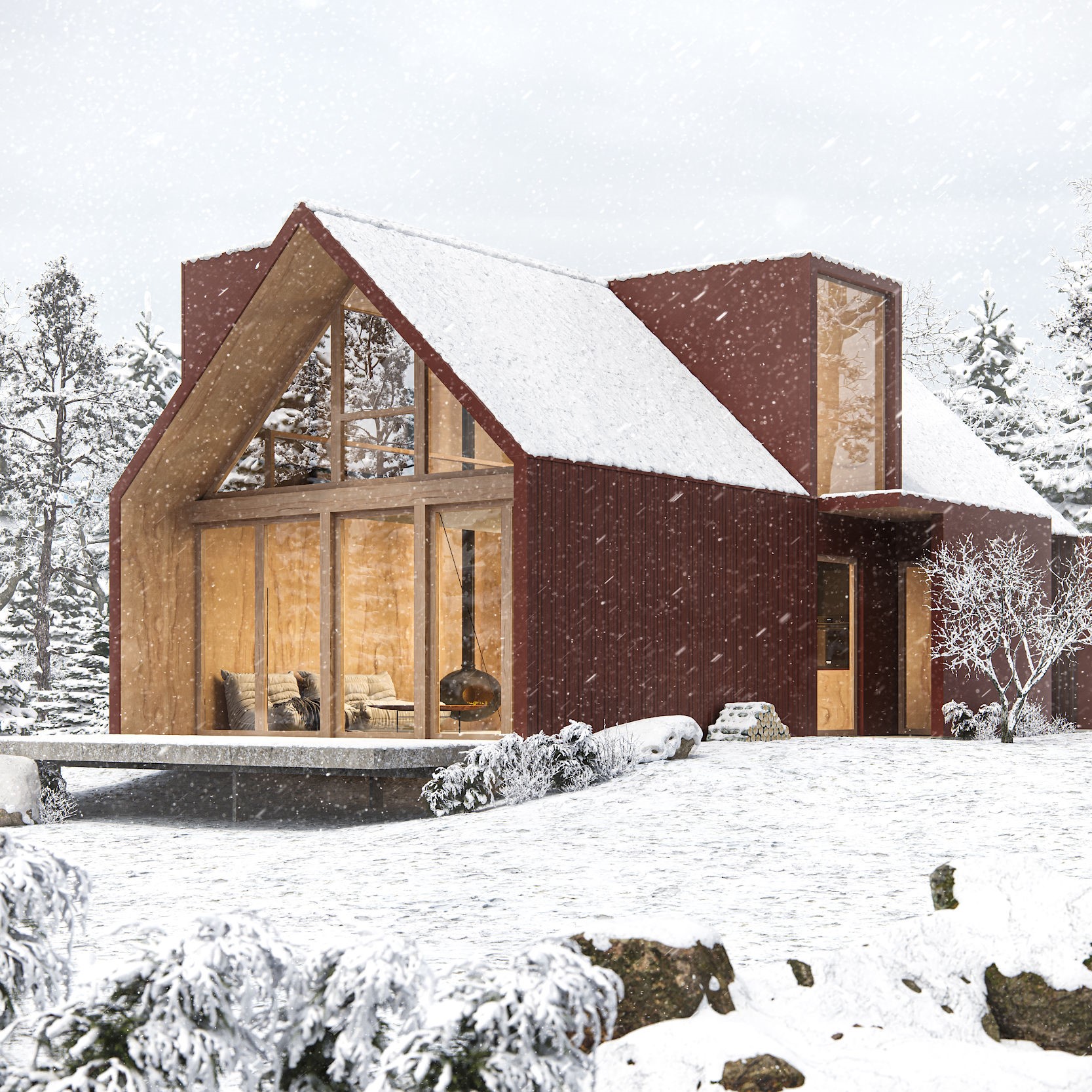 La construcción es concebida como las casas tradicionales fueguinas, de techos pronunciados, madera y chapa. El uso del rojo contrasta con la vegetación en verano y la nieve en invierno, agregando un elemento inesperado en el contexto.